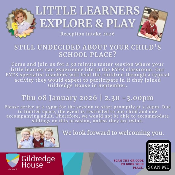 We are also offering a handful of lucky children the opportunity to have a taster session and sample one of our classes. On Thursday 8th January 2026 our EYFS specialist teachers will lead a session your child could typically expect to experience during their journey at Gildredge House. These spaces are strictly limited to children who have not made an application already and are still deciding what school suits them best. In addition, due to limited space, the event is restricted to one child and one accompanying adult. Therefore, we would not be able to accommodate siblings on this occasion, unless they are twins.
